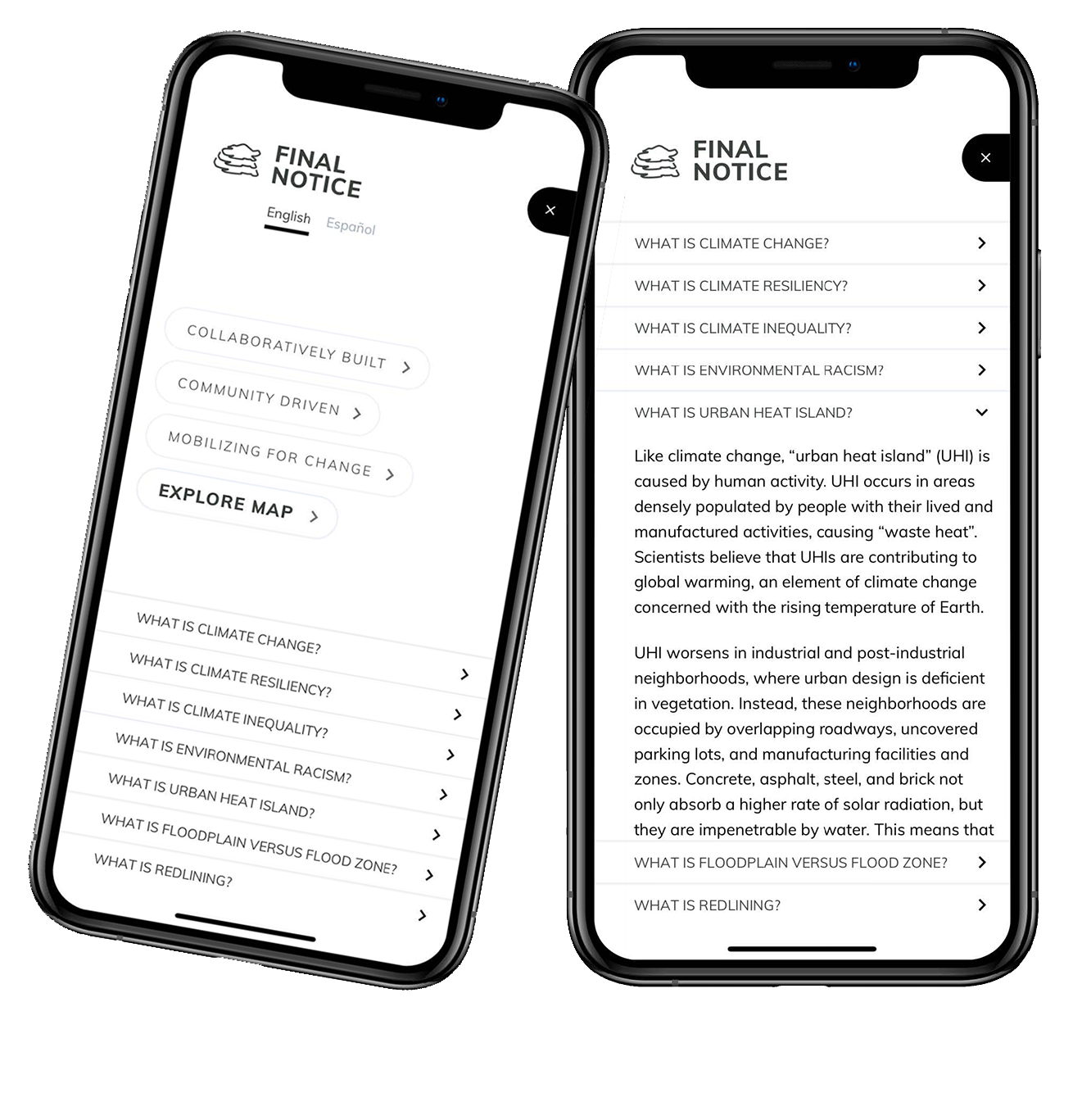 The first of its kind, the #FinalNotice app synthesizes past and living histories, community resources, and scientific research to steer users toward actionable, everyday solutions and initiatives in the immediate area—those already actively working to dismantle structural racism and build local, urban resilience in the face of climate change.